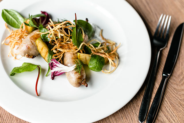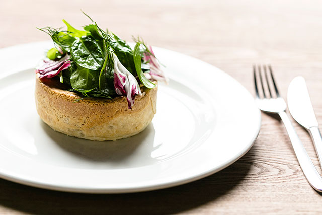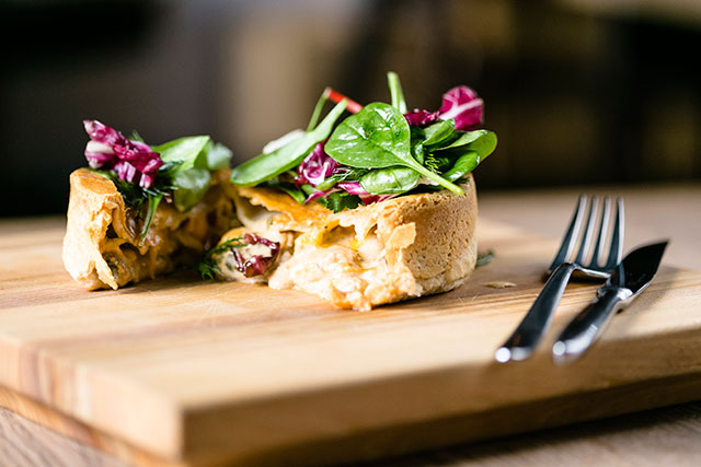 Классику пивной кухни Пантюхов изучил и перелопатил так, чтобы не стыдно было показать скромное меню «Совы и топора» кулинарным кумирам. Чипсы из картошки (160 руб.) здесь делают сами, а не сыпят из пакета — элегантный ход номер раз. Брускетта со скумбрией (прозрачные завитки огурца, собственное холодное копчение, мягкий сыр) подойдет и для вина, и для пива — ход номер два. Та же скумбрия с тартаром из свеклы (340 руб.) приобретает другой объем, с легкой перечной нотой. Явная удача — английские пироги с лососем, индейкой и говядиной (620, 440 и 580 руб.). Они сочные и плотные одновременно, теста в них немного, а удовольствия хоть отбавляй. Колбаски фаршируют сами, свиные с яблоком (420 руб.) удаются лучше ягнячьих (490 руб.). Прилежно выдержанную при низких температурах в печи рульку (920 руб.) тут со всем почтением величают свиным коленом. Сервированная с освежающими мочеными яблоками (ход номер три), она способна произвести впечатление не только на пиволюбов.