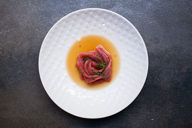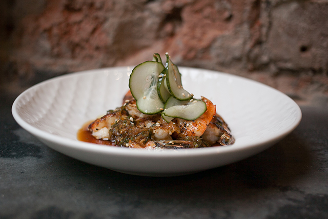 Интерьер выглядит так бедно, словно специально хотели не стыдиться рассказывать, как дорого он стоил. Ковер из метлахской плитки, нарочито ободранная до первого слоя стародавней штукатурки стена, прорезанная высокими окнами, забранная стеклянной фреской с разлапистым изгибистым драконом другая, столики (неброские, маленькие, на фоне которых нагло цветет маком стол на пятерых для компаний посреди зала) со стульями на штампованных металлических ножках, и окруженная контактной стойкой-столом открытая кухня. Сюда никто не хочет садиться, потому что за этой стойкой неудобно разговаривать. А Cutfish придуман для того, чтобы получать удовольствие от общения.