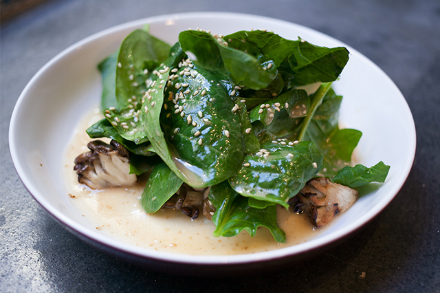 Все это хорошо сделано, но не обладает и десятой долей той запредельной притягательности, которой соки и ароматы хоспера наделяют салат их сбрызнутых кунжутной заправкой листьев шпината и печеных на углях грибов майтаке (490 руб.). Когда на стол приносят простую белую тарелку с этим салатом, все разговоры прекращаются. Сквозь скучноватую зелень шпината пробивается аромат такой силы, что распластавшиеся грибы легко принимаешь за тонко нарезанные кусочки мяса. Виртуозный trompe l'oeil, который для равновесия меню стоило бы поддержать хотя бы еще одним блюдом.