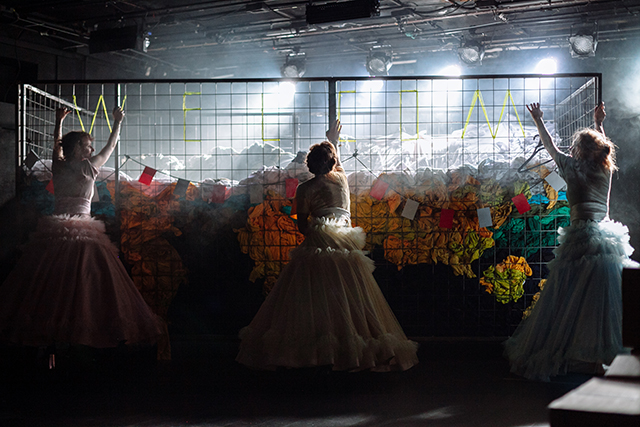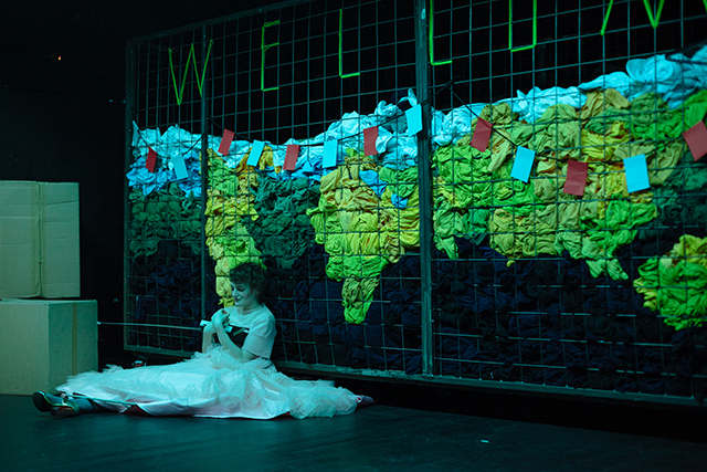 На сцене «Практики» — огромный контейнер, доверху наполненный смятыми вещами. Перед ним — скучающая девушка в пышной пачке. Голос из репродуктора говорит: «Любые совпадения случайны» — действие начинается.