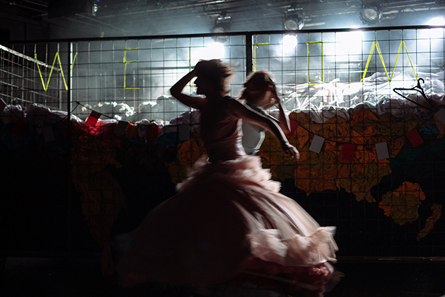 Каждая из них по-своему загнана в угол: Лизль пытается забыть довольно темное прошлое и свою работу проституткой, Кати боится за своего ребенка, а Ханни подговаривает всех на протесты, которые результата совсем не приносят. Те самые слова из названия спектакля — «нужно быть благодарным» — произносятся, и даже не раз, уже в прологе. «Нужно быть благодарным, что тебя не затоптали в метро», «Нужно быть благодарным, что сумел найти выход», — говорит врывающаяся на сцену Кати, обращаясь прямо к залу. Зрители, к слову, это члены неправительственной организации, которые приехали в Вену на осмотр фабрики. Перед ними-то и должны распинаться швеи, рассказывая, как хорошо они живут. Ситуация, разумеется, быстро выходит из-под контроля — и вместо заготовленных фраз звучит не слишком лицеприятная правда, а фальшивые улыбки сменяются искренним отчаянием.