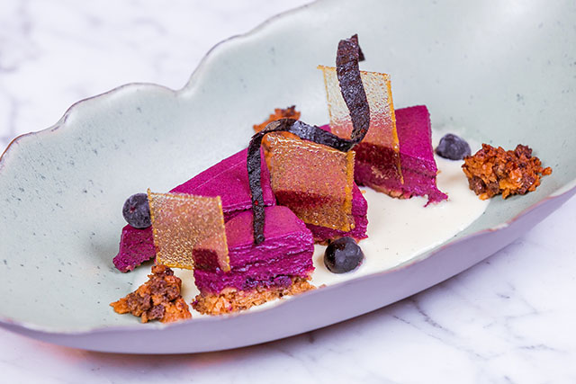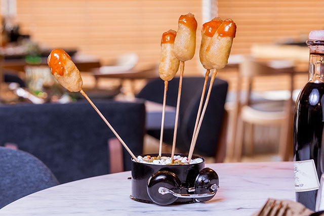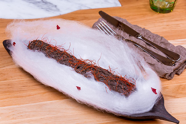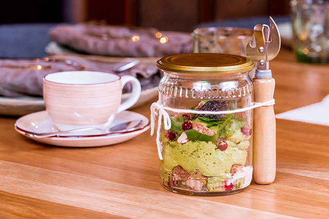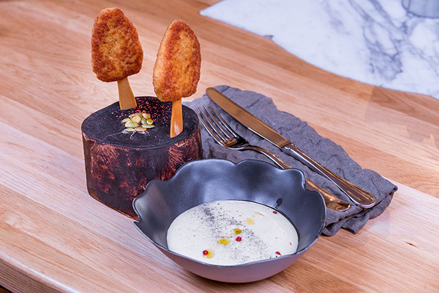 Чтобы сразить и завоевать, TheMaDCooK использует классический прием шоковой терапии. АвокАДСКОЕ тирамису с савоярди (550 руб.), похожее на кляксу строительной замазки вителло-тоннато во мраке (480 руб.), розовые «безумные» помидоры с ялтинским луком и каперсами (820 руб.), спрятанные грибно-сырные пирожки (290 руб.), ризотто с неодинаковыми грибами «и их много» (620 руб.), котлеты «Эскимо» — все это быстро привлекает внимание и разжигает любопытство. Рапортуем: авокадское тирамису составляют пропитанные в томатном фреше савоярди и мусс из авокадо с мелко рубленным огурцом для экстрасвежести и хруста, «мрак» к вителло-тоннато добавляют чернила каракатицы, безумия помидорам — их вкус, пирожки прячут в горшке с пшеницей, в ризотто грибов (древесные, белые, шиитаке) больше, чем риса, а котлеты насаживают на палочку от мороженого — такой вот получается детский вкус во взрослой обертке. Тем, кому мало, рекомендуется десерт «Закатанные щи» (380 руб.) — гречневую меренгу, щавелевый мусс, мороженое из ряженки и бруснику, натурально, приносят в закатанной банке, которую вам предстоит самостоятельно вскрыть консервным ножом. Еще один аттракцион — макарон (120 руб.) со вкусом том-ям, карри, мисо-кунжута или овечьего сыра.
