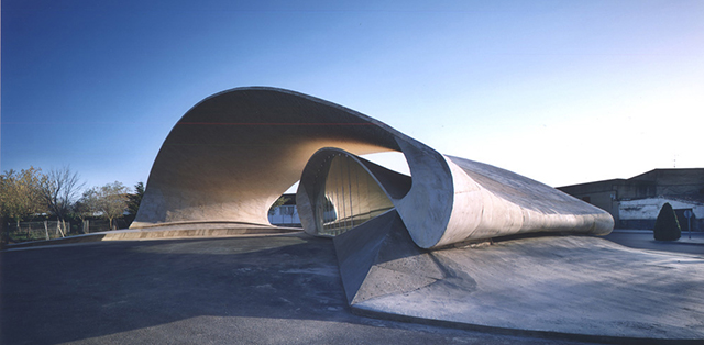 Пожалуй, самая знаменитая автобусная остановка в мире: ее придумал испанский архитектор Хусто Гарсия Рубио. Он традиционно создает свои проекты из единого материала, и остановка не стала исключением. Огромная бетонная лента сворачивается в сложную параметрическую форму, которую едва ли можно назвать утилитарной, но при этом трудно поспорить с тем, что архитектору удалось создать достаточно экспрессивный проект. Во внутреннем витке спирали располагается кафе, а сквозь внешнюю арку проезжает автобус.