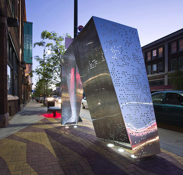 Заданием архитекторов было придумать одновременно выразительные и функциональные остановки: они должны были стать частью большого проекта публичного искусства, которое сейчас активно развивается в городе. Архитекторы предложили хитрую конструкцию, которая складывалась из единого стального листа. За счет использования только одного материала объект получился выразительным и скульптурным, а перфорация сделала остановку проницаемой для ветра и свежего воздуха. Вечером павильон освещается изнутри и отбрасывает свет на стоящие рядом здания.