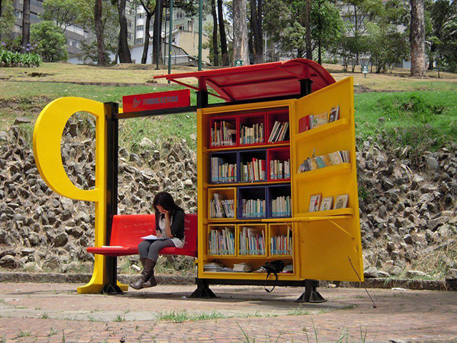Совершенно противоположная идея — и полностью некоммерческая программа. В остановки встроены книжные шкафы, так что каждая работает как обычная библиотека. Около таких павильонов дежурит волонтер, который помогает с выбором книги, а иногда и подсказывает детям, как правильно сделать домашнее задание. В самой Боготе таких остановок 47, а по всей стране их работает уже более 100.