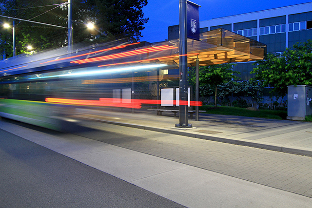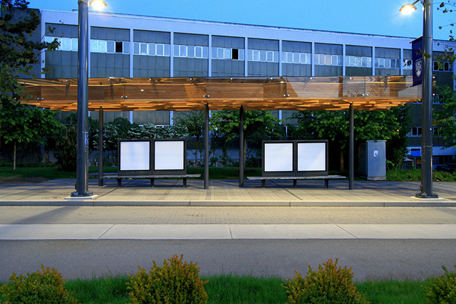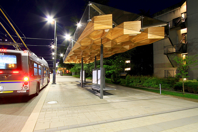 Строительство новой остановки стало частью реконструкции бульвара рядом с университетом. Деревянная крыша задумывалась как продолжение соседних деревьев: издалека кажется, что и они, и павильон отбрасывают одну и ту же рассеянную тень. Тонкие стальные опоры не мешают сильному потоку студентов, которые проходят по бульвару несколько раз в день. Каждая деталь остановки несет двойную функцию: опорные колонны помогают собирать дождевую воду, а скамейка одновременно выступает опорой для навигационной карты. Напоминающий деревянные спилы потолок изготавливался вручную мастерами по дереву — чтобы держать эту сложную конструкцию, потребовалось с ювелирной точностью забить 12000 гвоздей.