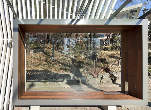 Остановка стоит на дороге, огибающей гору, и своей формой прежде всего обыгрывает природный рельеф. Дизайнеры попытались создать окружающей природе достойное обрамление, поэтому главный элемент остановки — стальная рама, подчеркивающая окружающий парк. Павильон собран из трех составляющих, каждая из которых имеет собственные материал и функцию: бетонный вход разделяет потоки пассажиров, деревянная скамья, как нетрудно догадаться, предназначена для отдыха, а стальная рама превращает природу вокруг в часть самой остановки.