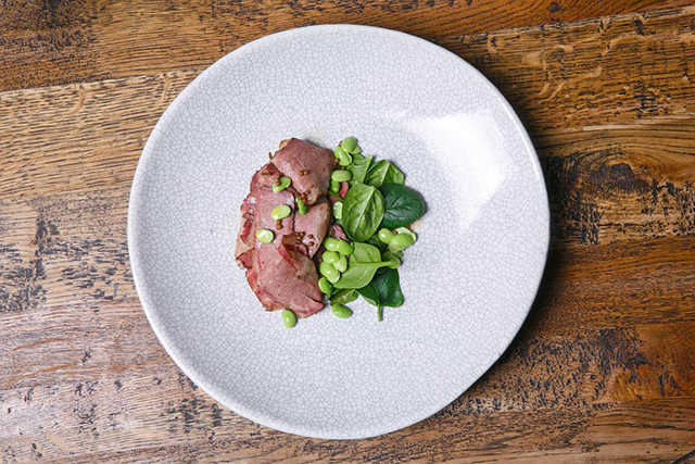 Пастра́ми и эдама́ме (370 руб.) на слух образуют чужестранную рифму, а в тарелке соединяются в радостную палитру из сочащегося розового мяса и весенне-зеленых бобов. Листья горчицы, демиглас и кориандр добавляют этому буйству цвета пикантный аромат.