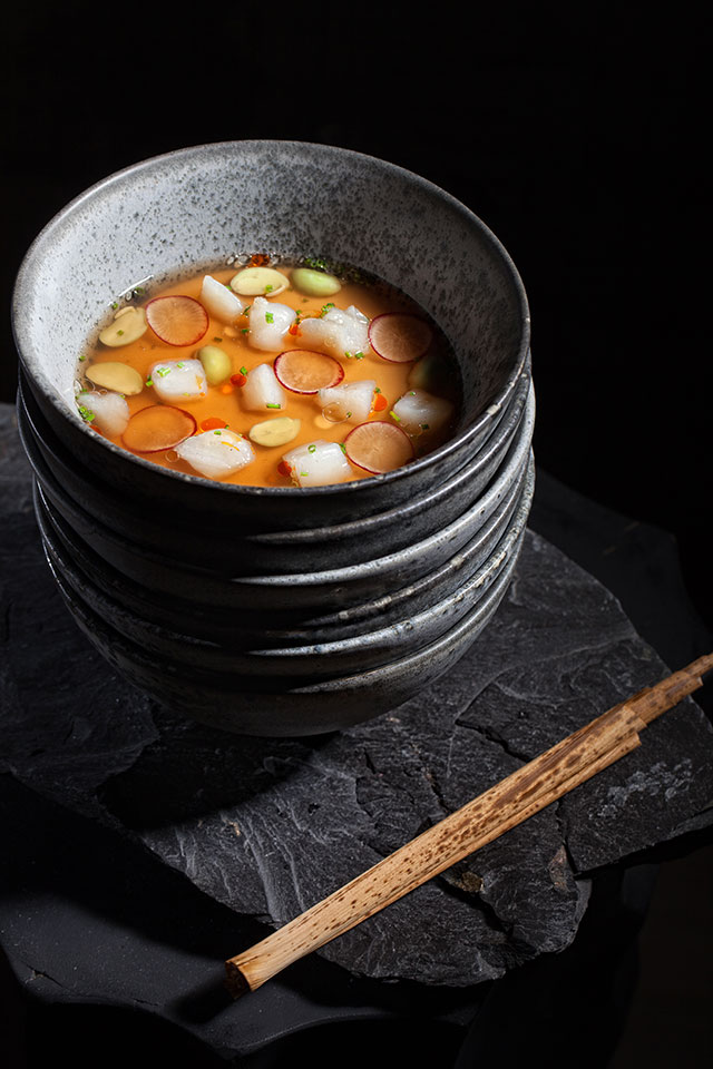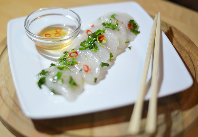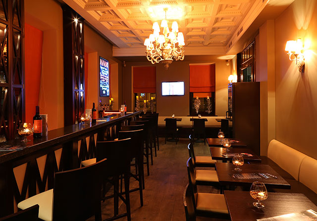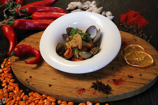 На первом этаже ресторана «Рыбный базар» долгое время была прописана рюмочная в русском стиле, с гармонистом и сарафанами. А сейчас открылся классический лаундж-бар, где подают устрицы в свежем и горячем виде и коктейли с устрицами же. В коктейльной карте — широкий выбор как классических, так и авторских коктейлей, один из них подается как «Коктейль дня» всего за 150 рублей. Цены настолько вменяемые, что даже не верится. Ужин в паназиатском стиле обойдется в пределах 1000 рублей. И это притом что во всех рыбных и морепродуктовых блюдах используют ингредиенты высшего качества, ровно те же, что и в ресторане этажом выше, а не какие-то там обрезки. Скажем, хе из тунца, сибаса, семги и вонголе с соусом кимчи дайчо (430 руб.) — это миска недешевой рыбы в свежем соусе. Сычуаньский салат с каракатицей (250 руб.), чуть островатый и яркий, хорош мини-пузырями идеально приготовленного моллюска. Сливочный суп с мидиями и китайской пресной лепешкой (380 руб.) отдает сладким запахом вареной сгущенки. Его, конечно, адаптировали к российскому вкусу, но он все же недалеко ушел от китайского оригинала, в который, натурально, добавляют сахар. Пухлые креветки-колокольчики (245 руб.) в воздушном ванильно-пшеничном кляре — ответ тщательно скрываемого китайского создателя меню на всеобщее увлечение креветками-васаби. Жареные спринг-роллы с тушеным утиным рагу (390 руб.) могут сделать честь любому шефу, работающему на стыке азиатской и европейской кулинарных традиций.