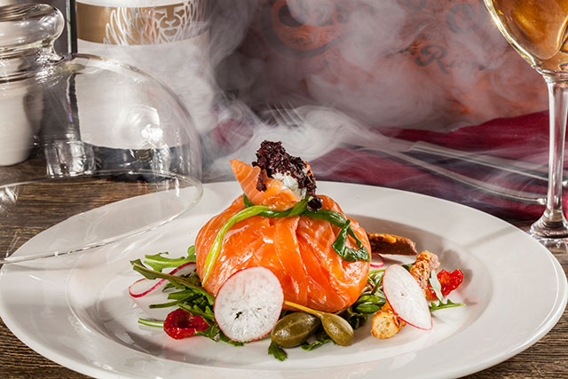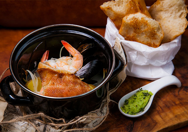 Так, например, к копченой форели «на удочке» (1 195 руб.) рекомендовано заказывать темное пиво «Рошфор 6», сваренное в одном из Траппистских монастырей Бельгии по старинному рецепту. К мраморному стейку «Чак Ролл» с поджаренной гречневой крупой и соусом из белых грибов, каперсов и черри (695 руб.) отлично подойдет как красное сухое вино, так и немецкий темно-рубиновый пшеничный «Шнайдер Тап 6 Унзер Авентинус». Редкое для Москвы блюдо фламекеш — тонкая бельгийская лепешка с разнообразными начинками (395—495 руб.) — сочетается сразу с пятью сортами хмельного напитка. Для больших компаний здесь есть ассорти закусок (1 395 руб.), утка по-фламандски с брусничным соусом и айвой (1 950 руб.), а также большая доска с фирменными мясными специалитетами и горячими блюдами на гриле.