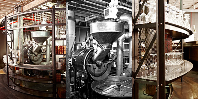Внимание посетителей буквально приковывает к себе массивная барная стойка из металла, за которой виднеется огромная старая машина для обжарки и приготовления кофе. Благодаря своим конвекционным свойствам этот аппарат за спиной чернокожего баристы готовит ароматный кофе, как по старым рецептам 60-х.