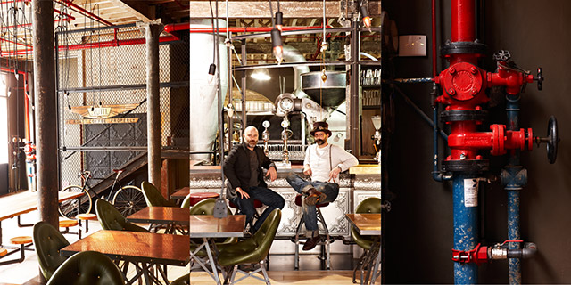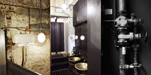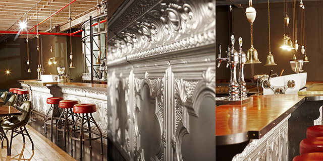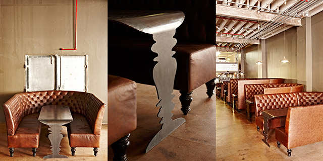 Идея дизайна, принадлежащая компании Haldane Martin, отсылает к эпохе паровых машин и технологий конца XIX века. Глаз невольно скользит по просторному помещению, выхватывая металлические трубы, винтажные плакаты, старинные агрегаты, простую деревянную и темно-коричневую кожаную мебель, и вдруг внезапно застывает на барной стойке, которой стоит уделить особое внимание.