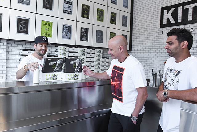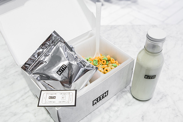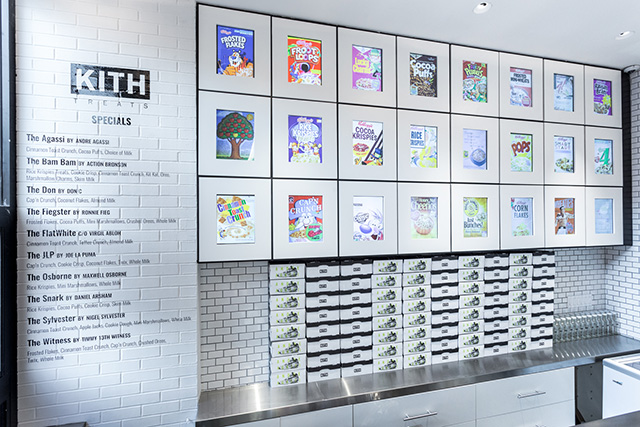 Самым большим подарком поклонникам магазина, на наш взгляд, стал открывшийся на его территории зерновой бар Kith Treats. В витрине представлено целых 24 различных сорта хлопьев, 25 видов топпингов и 5 видов молока: миндальное, конопляное, шоколадное и другие, — а это значит, что нет пределов для гастрономической фантазии. В стандартный заказ входит один вид молока, два сорта хлопьев и два топпинга на выбор. Созданный по вашему вкусу микс подадут в индивидуальной упаковке, в которой завтрак можно запросто взять с собой. Хотя полагаем, что перекусить в новой обстановке KITH — особое удовольствие.