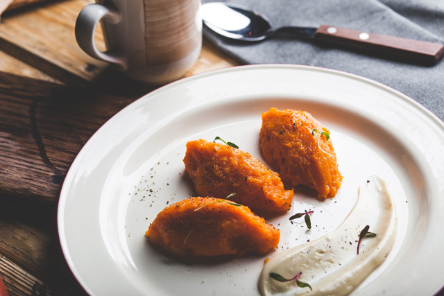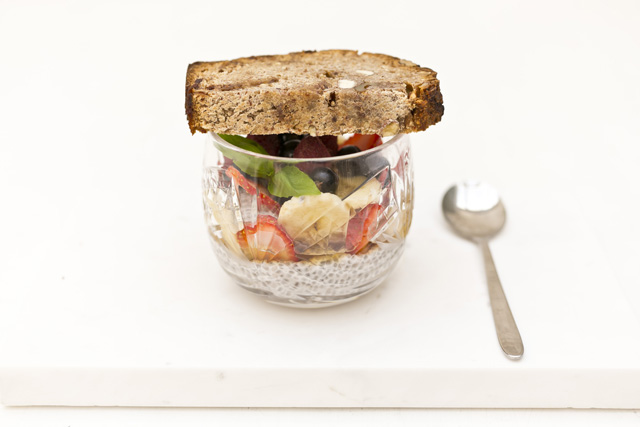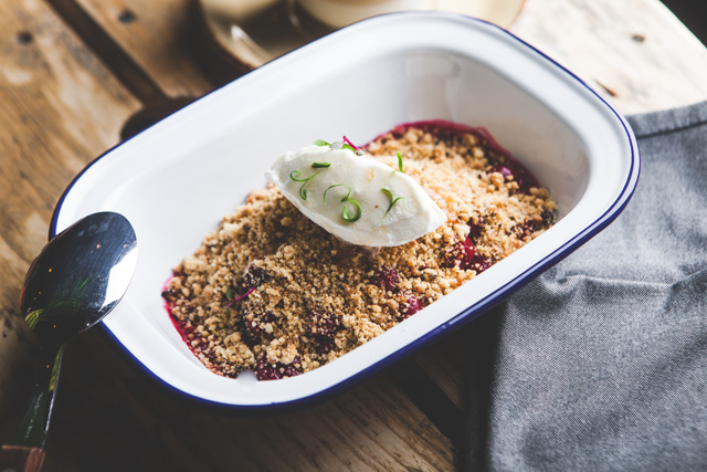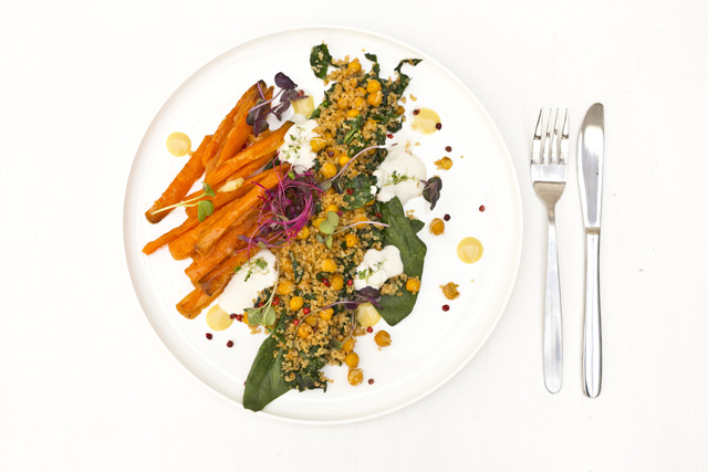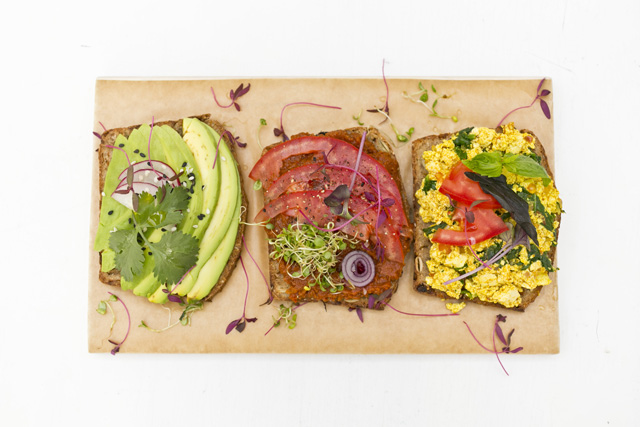 Все меню готовят на цельнозерновой муке, сахар, сливочное масло, яйца, молоко, сливки, дрожжи не используют. Весь день подают завтраки: кашу с бананом, черникой и розмарином (300 руб.), омлет из тофу с томатом и брускеттой (350 руб.), банановый хлеб с домашней арахисовой пастой (200 руб.), чиа-пудинг на ореховом молоке с ягодами (350 руб.). Еще есть тосты из поленты с песто и луковым мармеладом (350 руб.) и сытные оладьи из нутовой муки с теплым шпинатом и сливочным соусом из кешью (350 руб).