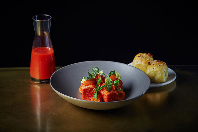 Этот утомительный географический экскурс нам необходим потому, что новый ресторан на седьмом этаже «Цветного» объединяет кухню всех этих стран в аранжировке шеф-повара Режиса Тригеля. В меню рядом с блюдом указывается, рецепт какой именно страны послужил для него основой. Вот, скажем, хорватский салат с осьминогом и кальмаром на гриле, баклажановой икрой и перцем-конфи со сливочным сыром внутри (1 500 руб.). Киноа, маринованный в мириновой пасте ростбиф и спаржа (980 руб.) символизируют Аргентину, где растет модный фрукт (так считают ученые-ботаники, относящие киноа к псевдозерновым культурам), едят много мяса и выращивают не меньше спаржи. Россию представляет элегантная версия кулебяки с лососем и грибами (680 руб.), Францию — куриное яйцо 62º «а мюрет», в котором виртуозно приготовленное яйцо демонстрирует идеальную, словно стекленеющую структуру. По сути, ресторан предлагает гастрономическое путешествие вокруг света: сегодня вы едите украинский борщ с пампушками, завтра — итальянский томатный суп или французский луковый, а через день закажете американский кукурузный суп с курицей.