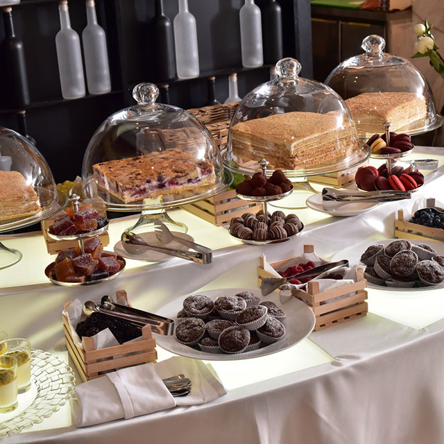 Десерты (наполеон, мильфей, эклеры и макаронс) милосердно представлены в щадящих размерах, хотя и им щедрый выбор фруктов и ягод (мушмула, киви, голубика, ежевика, клубника, арбуз, малина) не оставляет почти никаких шансов.