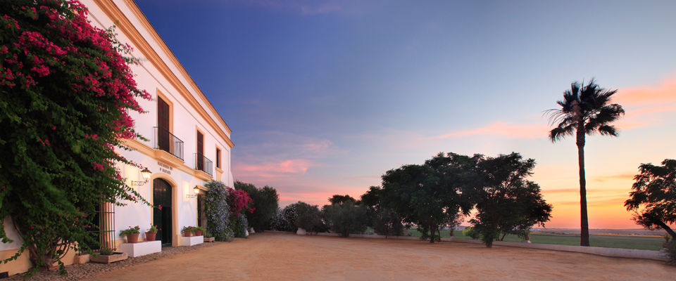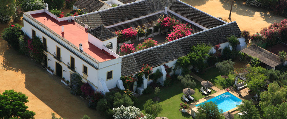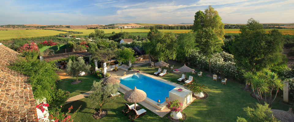 Отель Hacienda de San Rafael находится не в городе, а в нескольких сотнях километров от Севильи, в Андалусии, а потому он окружен растительными полями и тенистыми садами.