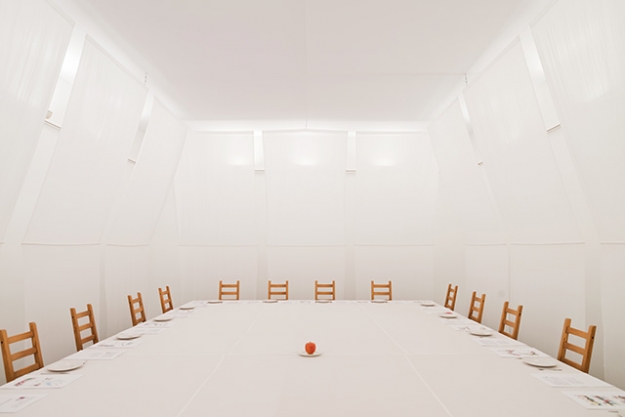 Впереди еще два урока, которые прекрасно дополняют друг друга: один призывает к самоорганизации, другой — объединиться против общего врага. Квинтэссенцией самоорганизации стала инсталляция адептов концептуализма Ильи и Эмилии Кабаковых с говорящим названием «Двадцать способов получить яблоко, слушая музыку Моцарта»: в центре огромного стола находится означенный плод, а в конец изголодавшиеся гости медитативно размышляют, как бы его получить быстрее других, — ироничные способы это провернуть прилагаются к столовым приборам.