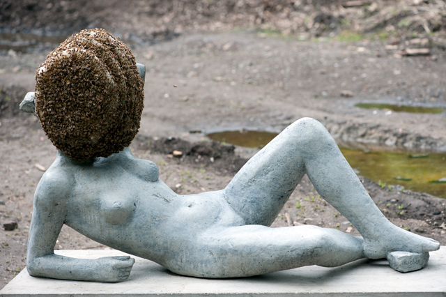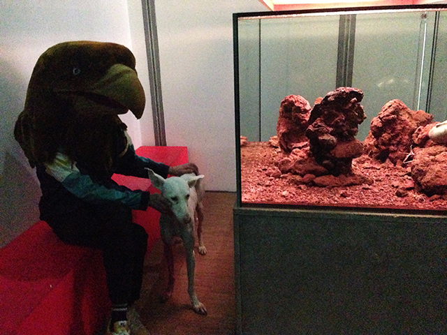 Флориан также показал нам подборку работ Пьера с предыдущей "Документы", которая включает в себя скульптуру с ульем на голове из живых пчел (представляете, как я "обрадовалась", когда поняла, что нахожусь в помещении с кучей пчел!?) и видео, запечатлевшем собаку с розовой ногой. Когда я отошла от экрана, мне показалось, что я брежу — но нет, собака на самом деле пробежала мимо меня. Оказалось, что она — часть выставки! Здесь собака живет, бродит, подходит к посетителям, но не разрешает им себя трогать. Единственный, кто может ее коснуться — ее хозяин, человек, ухаживающий за садом, который Пьер создал на "Документе".