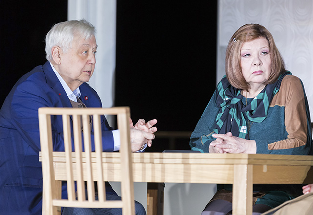 В центре просторной комнаты — стол. За столом — три человека. Старик Морис, его жена Хелен и сиделка Кэти (в миру — Олег Табаков, Наталья Тенякова и Дарья Мороз). Сиделку нанимают на работу. Исполнительная, без возраста, зато с серым хвостиком и, должно быть, вечно поджатыми губами — из таких в иные времена выходили образцовые немецкие гувернантки и надзиратели в работных домах. Хелен — молодящаяся, склонная к сарказму и обильному макияжу дама, разменявшая девятый десяток. Старик — некогда успешный, но давно разорившийся ювелир. Он немногословен, склонен к иронии и потихоньку умирает от рака.