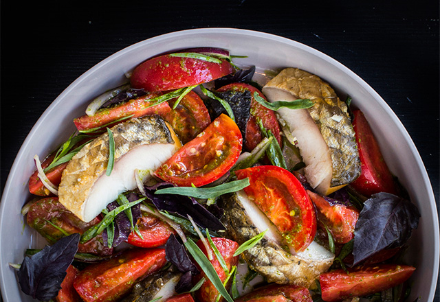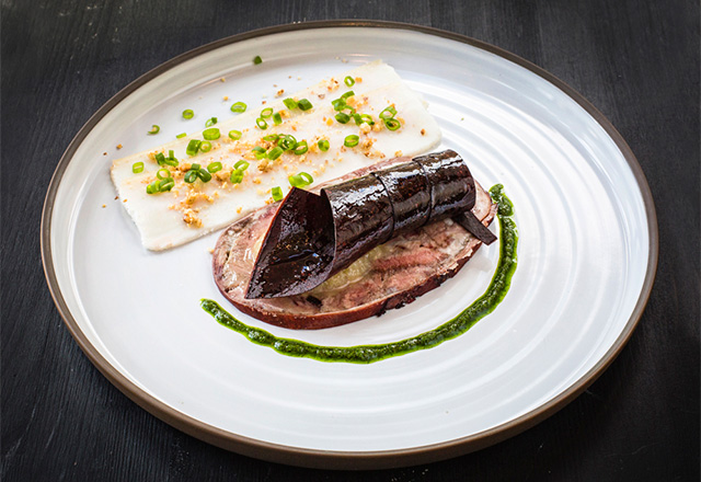 Или возьмите бараньи язычки (550 руб.) на подушке из сладкопомидорного рагу. Чуть хрустящая, плотная корочка и нежная, лопающаяся во рту мякоть напоминают икру, честное слово. Этой игрой в параллели между землей и морем, близкой китайской пейзажной живописи шань-шуй, меню полнится. Салат из копченого пиленгаса (эта рыба водится с Азовском море) с помидорами и соусом из петрушки (450 руб.), жареные рапаны с соленой хамсой и молодой жареной картошкой (350 руб.), дуэт пиленгаса с луковым пюре и говяжьих щечек с пюре картофельным прямо в одной тарелке (650 руб.), бургер из нутрии (490 руб.), наконец, — примеров предостаточно.