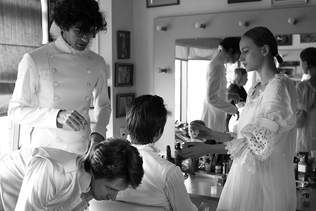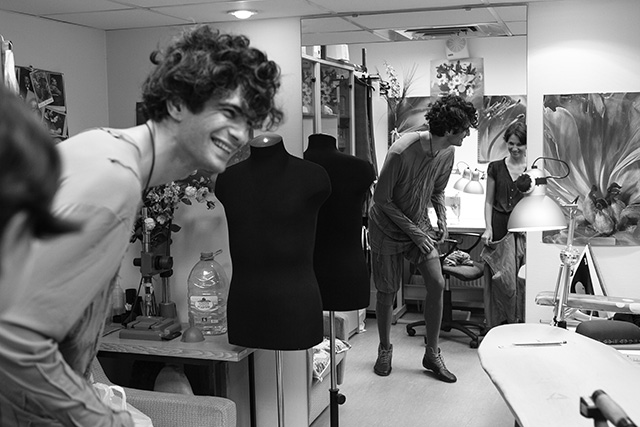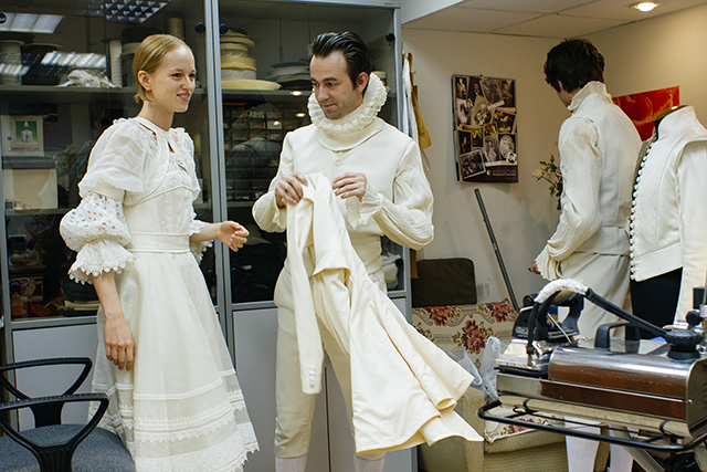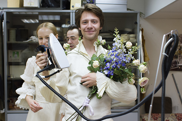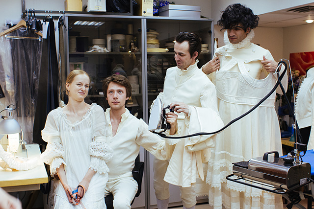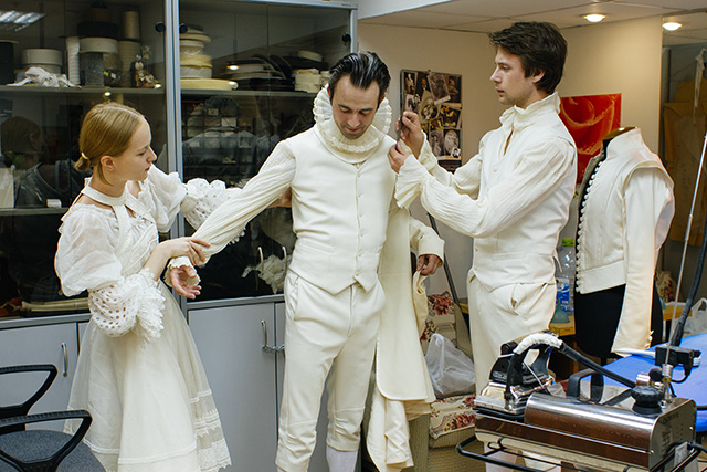 Переключившись с Эжена Ионеско («Носорог») и Николая Гумилева («Отравленная туника») на Шекспира, Иван Поповски выстраивает на сцене мир грез, любви и обмана, а помогают ему в этом не только однокурсники Галина Тюнина, Карэн Бадалов, Кирилл Пирогов, Рустэм Юскаев и Андрей Казаков (их, кстати, в театре по-дружески зовут «стариками»), но и молодое поколение «фоменок». Как раз пятерых из них: Амбарцума Кабаняна, Ирину Горбачеву, Юрия Буторина, Александра Мичкова и Серафиму Огареву — мы и попросили примерить костюмы, в которых сегодня вечером они выйдут на сцену. Артисты не растерялись, провели нас по театру, разыграли пару сцен из спектакля, ну и об импровизациях, разумеется, тоже не забыли. Амбарцум Кабанян так и вообще успел переодеться несколько раз — в постановке он играет и распорядителя празднеств Филострата, и Робина Доброго Малого из компании эльфов.