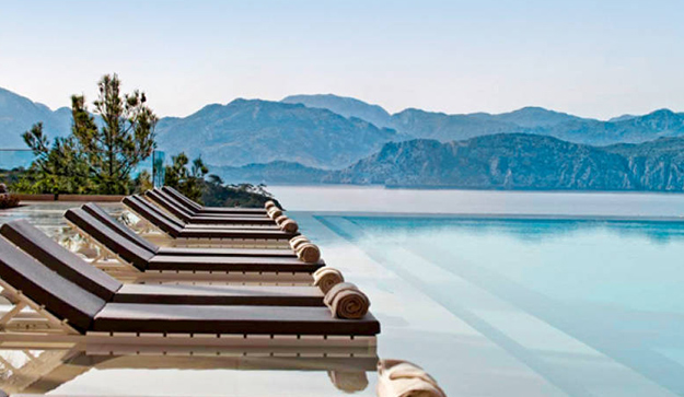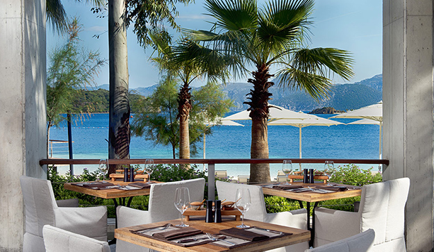 Придумано и продумано все — тут вообще не надо соображать, как попасть куда-то или как найти что-то. Между всеми пятью пляжами постоянно циркулируют лодки — не надо ждать времени трансфера, не надо даже никого просить, просто достаточно выйти на мостки, чтобы тебя увидели и подплыли. Вообще, при желании коммуникацию — с персоналом, с другими гостями — можно свести к минимуму. Тут даже есть пляж, на котором нельзя использовать телефон и громко разговаривать, нельзя приезжать туда с детьми (тут есть вообще ряд ограничений для детей), и называется он Silence. А есть пляж Coliseum — как раз в том месте, где сходятся Эгейское и Средиземное моря. И когда к просто бирюзовой соленой воде добавляется такой символический смысл, это особенный, неординарный момент. В начале каждого сезона на все пляжи привозят белый песок из Египта — который не просто красивее, чем местный темный, но еще имеет другой минеральный состав и не так сильно нагревается на солнце.
