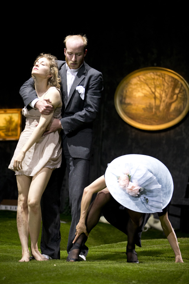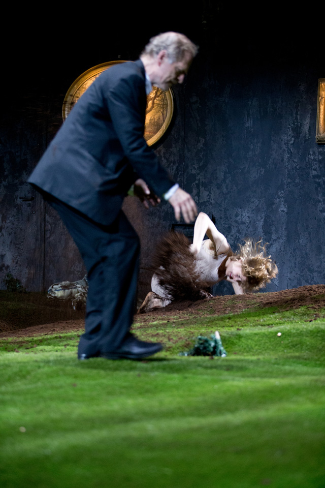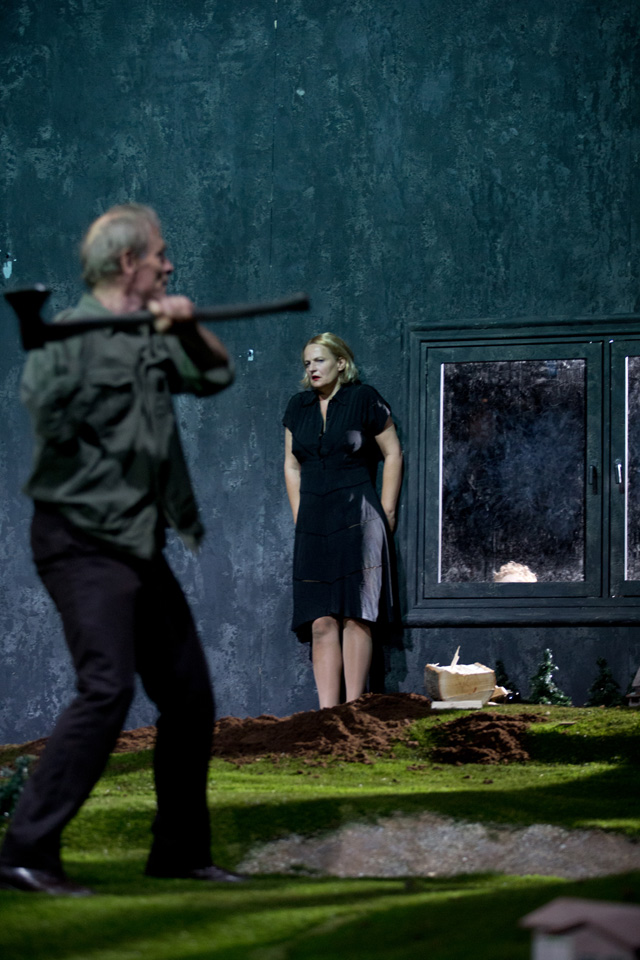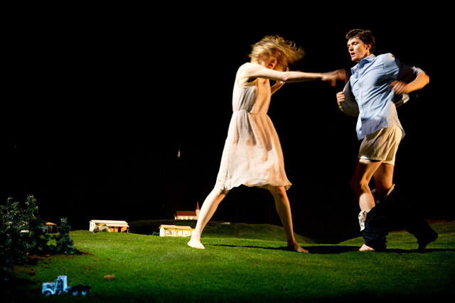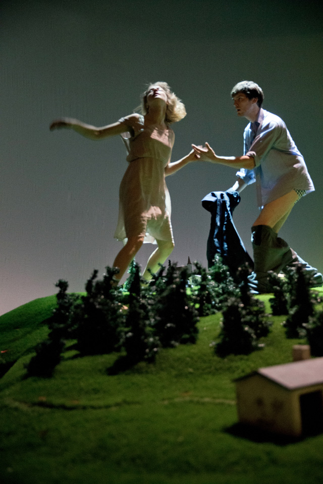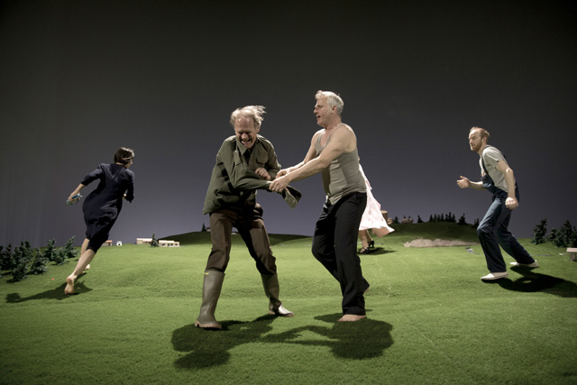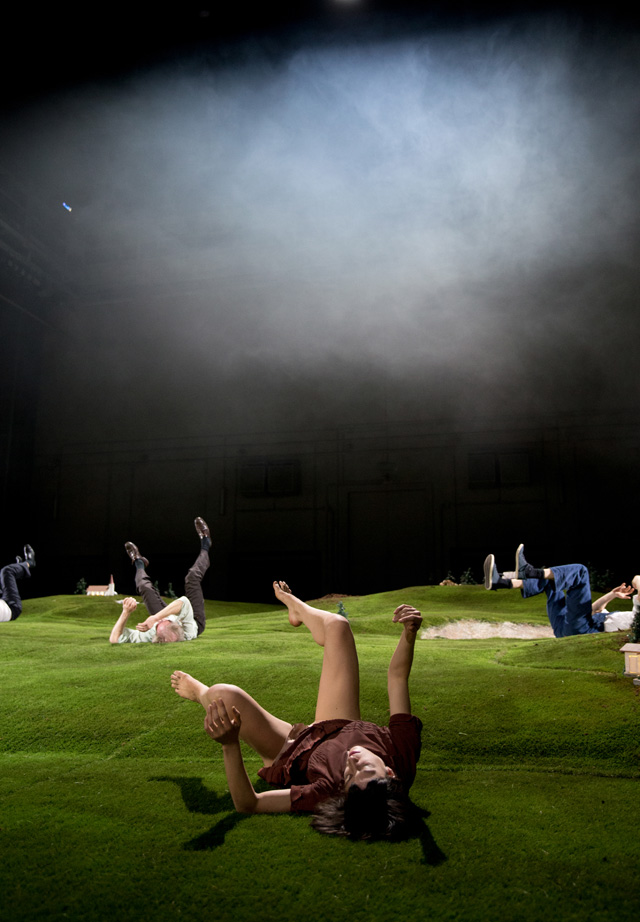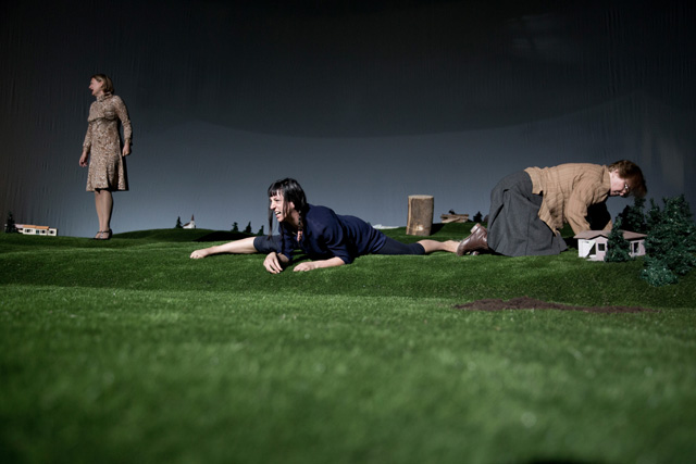 Гигантский ландшафт, который занимает почти всю сцену Театра наций, будто срез альпийского луга: с маленькими домиками, елочками и оврагами. Такой кусок земли представляется очень большим, пока на него не попадает человек, — люди в этом идиллическом пространстве кажутся несоразмерно огромными. Здесь рубят деревья, чтобы протопить печь и построить дом, собирают урожай, охотятся на животных, находят покой и радость в воскресных пикниках с семьей. И все человеку дает земля: работу, еду, сон, успокоение и отдых. Впрочем, как в страшной сказке, вскоре все сменяется карнавальным ужасом, смертью и приходящими перед ней видениями. «Резиденцтеатр» и режиссер Габриэла Карризо показывают на сцене триллер в духе «Твин Пикса» Дэвида Линча. Страшную сказку про то, как, сделав шаг, из гармонии и благодати человек по своей воле оказывается в оглушающей и оглушительной пустоте. И вот тогда природа перестает радовать красотой и закономерностью и тоже обращается против. Земля предстает уже неким утопическим пространством, неким солярисом, где придумал себе сказку — вот и живи в ней; это царство воплощенных в жизнь сновидений, в большинстве своем — ужасов и страхов: попал в лес и не вышел, зашел в речку и утянуло. Здесь прослеживается идея постоянного присутствия страха, который существует сплошь и рядом, проникая в обычные домашние дела и вещи. Именно они для каждого героя этот страх и подавленность знаменуют. Это не история от А до Я, здесь нет сюжета «родился, женился, умер», это скорее история сновидений, переплетающихся между собой.
