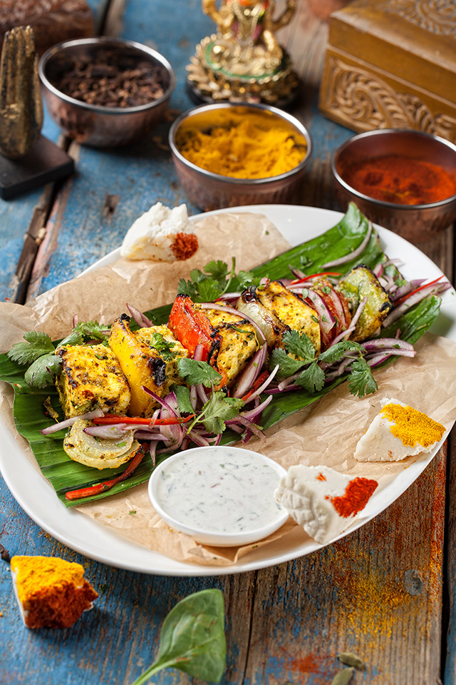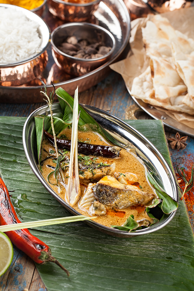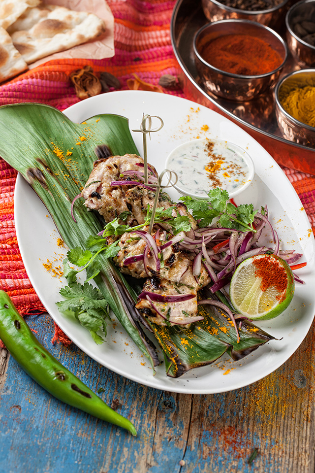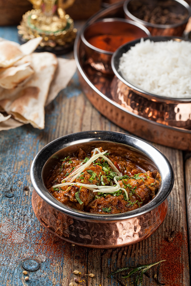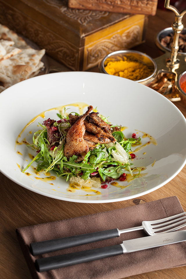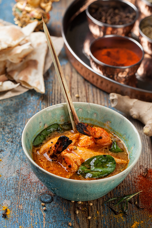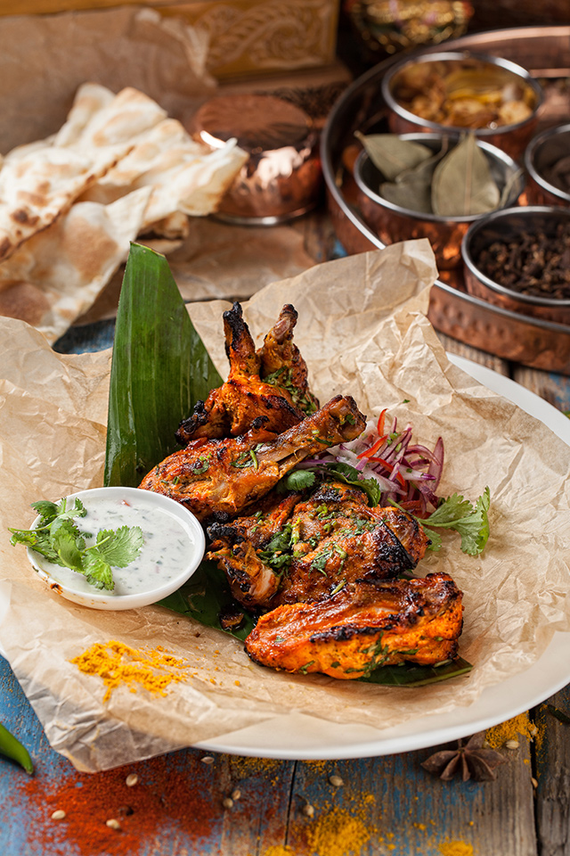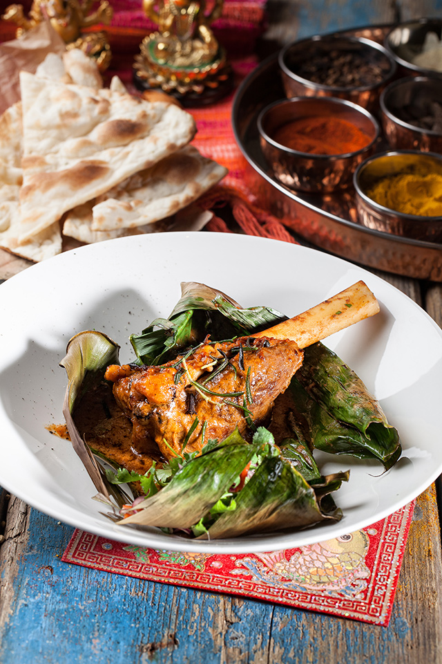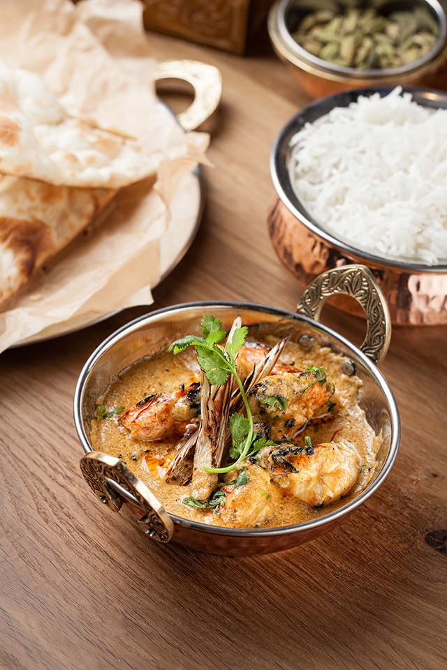 Наны, пресные лепешки, жарят с ягненком (250 руб.), сыром и чесноком (150 руб.), но лучше всего удается классический хрустящий нан (100 руб.) с легким соленым оттенком. Раздел салатов придуман «по мотивам», он скорее для тех, кто в Индию хочет только поиграть. Кухне отлично удаются блюда с курицей. Мург тикка (450 руб.), маринованная в сметане мякоть цыпленка, зарумянена с зирой, карри, горчичным маслом и чили — сложно представить себе что-то более нежное. Мург махани (450 руб.) — цыпленок в томатно-ореховом соусе — чуть островат, но не менее хорош. Карри стоит пробовать с морепродуктами (750 руб.). Из вегетарианских блюд удались самосы (250 руб.) с картофелем, зеленым горошком и кешью. Жаль, что самосы с мясом отсутствуют, — стали бы хитом. Их пробуют заменить жареными пельменями мо мо с цыпленком и ягненком, но и тесто, и мясо в них пересушены, так что никакой радости от них не чувствуешь.