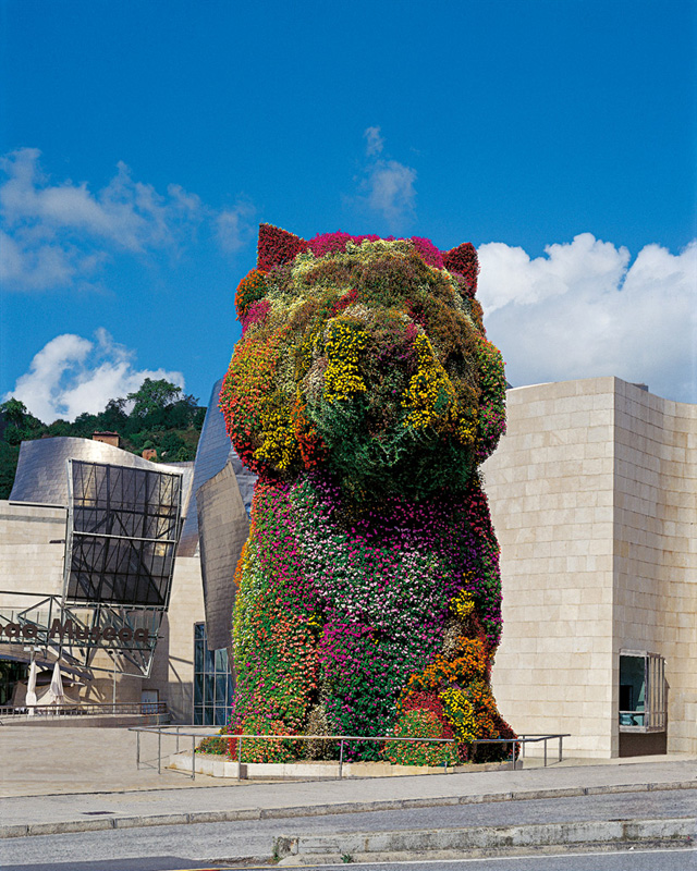 Собаки — одна из самых популярных тем в творчестве Кунса. Сегодня больше всего известны его зеркальные скульптуры, особенно после того, как в прошлом году Christie's удалось продать работу Balloon Dog за $58,4 млн. Но самой первой знаменитой "собакой" Кунса стал 13-метровый "Щенок", весь украшенный цветами. В 1992 году скульптор представил его в Германии, после чего "собака" несколько раз переезжала, пока наконец не обосновалась во дворе музея "Гуггенхайм" в Бильбао.