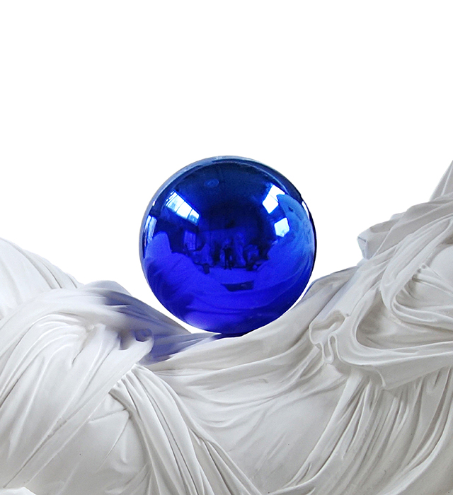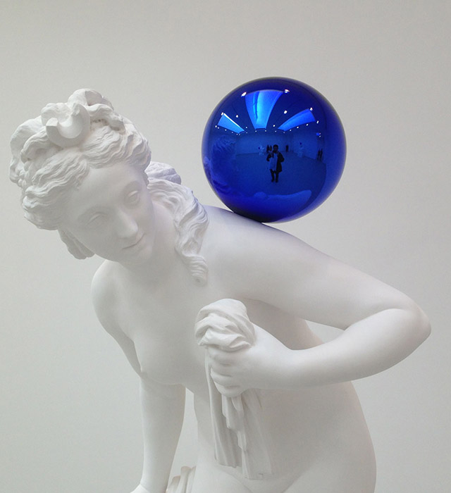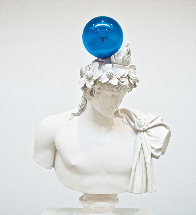На первый взгляд в белоснежных скульптурах из серии Gazing Ball почерк Джеффа Кунса не узнать. На второй, признаться, тоже — "снежные" человеческие фигуры, застывшие в различных позах с синими шарами на плечах, ладонях и других частях тела, вообще не похожи на то, что делает скульптор. Серию этих работ Джефф Кунс впервые представил около года назад, когда в Нью-Йорке шли сразу две его выставки. Открыть публике скульптуры Gazing Ball решил один из крупнейших галеристов мира — Дэвид Цвирнер.