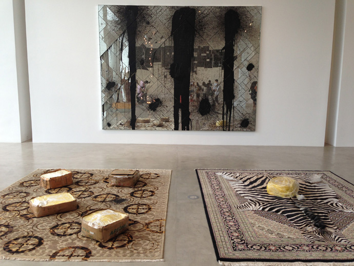 Впервые работы Рашида Джонсона я видела на одной из арт-ярмарок. Ему был отдан целый стенд, который был с его легкой руки заполнен непонятными объектами, от которых невозможно оторвать глаз. Я тогда увлекалась южноафриканскими зебрами и иранскими коврами, а он использовал именно эти материалы. Афроамериканец по происхождению, Рашид женился на иранке, и каждая из его работ — рассказ про identity через разные объекты и материалы, присутствующие в этих двух культурах.