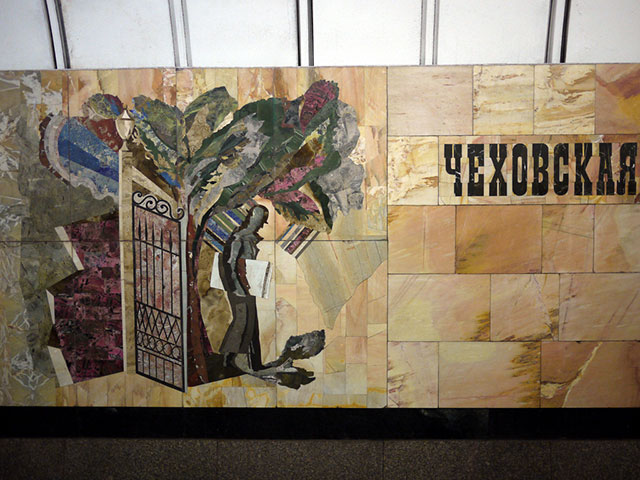 Хоть сегодня и кажется, что она была всегда, станция метро «Чеховская» открылась относительно недавно, в 1987 году. Соседствуя с другой станцией, также названной в честь великого писателя, «Пушкинской», она привлекает немало туристов, и неслучайно: стены «Чеховской» украшены мозаикой по мотивам многих произведений автора, среди которых оказываются, к примеру, «Человек в футляре», «Дама с собачкой», «Вишневый сад», «Дом с мезонином», — отличный повод вспомнить о классике в суматохе дня.