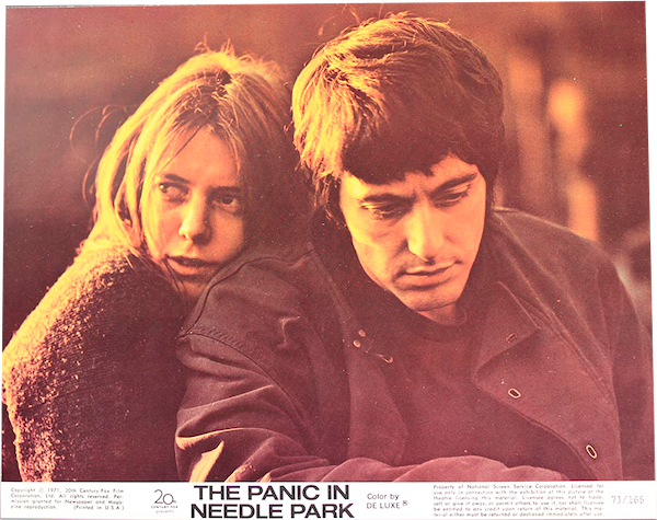 Первая серьезная роль Аль Пачино — парень из Нидл-парка из хрестоматийного независимого фильма Джерри Шацберга «Паника в Нидл-парке» 1971 года. Так называет пересечение Бродвея и 72-й улицы в западной части Нью-Йорка молодежь, сидящая на игле. Жизнерадостный, но изъеденный жаждой бурого химического вещества, безработный и без постоянного места жительства, его герой был способен на самые разные, в том числе незаконные, авантюры. Но уже тогда, в роли «white trash» на игле, последнего общественного отброса Аль Пачино не выглядел жалким. Его экранная девушка Китти Уинн — выглядела, а он нет.