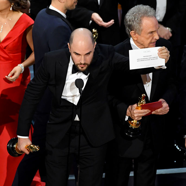Мюзикл Дэмьена Шазелла получает шесть статуэток, букмекеры, насвистывая City of Stars, уже потирают руки в ожидании седьмой — 89-я церемония вручения «Оскара» проходила без всяких сюрпризов. Вот на сцену поднимаются Бонни и Клайд всея Голливуда — Уоррен Битти и Фэй Данауэй. Битти открывает конверт, в замешательстве смотрит на листок, затем на Данауэй и Киммела, после чего передает листок своей соведущей, которая объявляет победителем «Ла-Ла Ленд». Звучат аплодисменты, продюсеры мюзикла Джордан Хоровиц и Фред Бергер начинают рассыпаться в благодарностях.