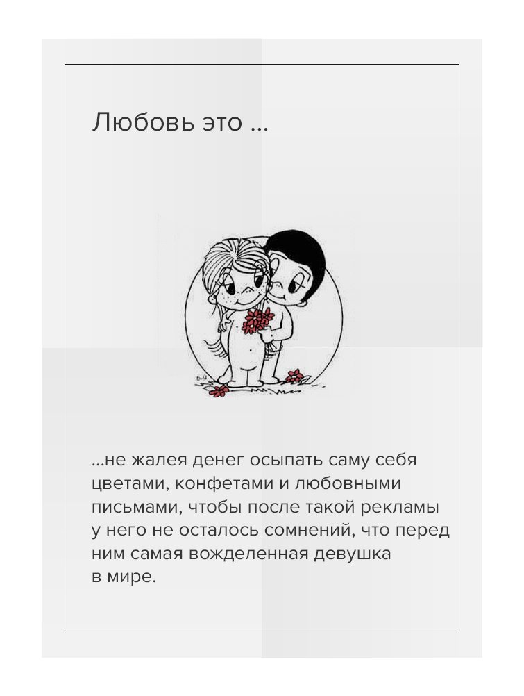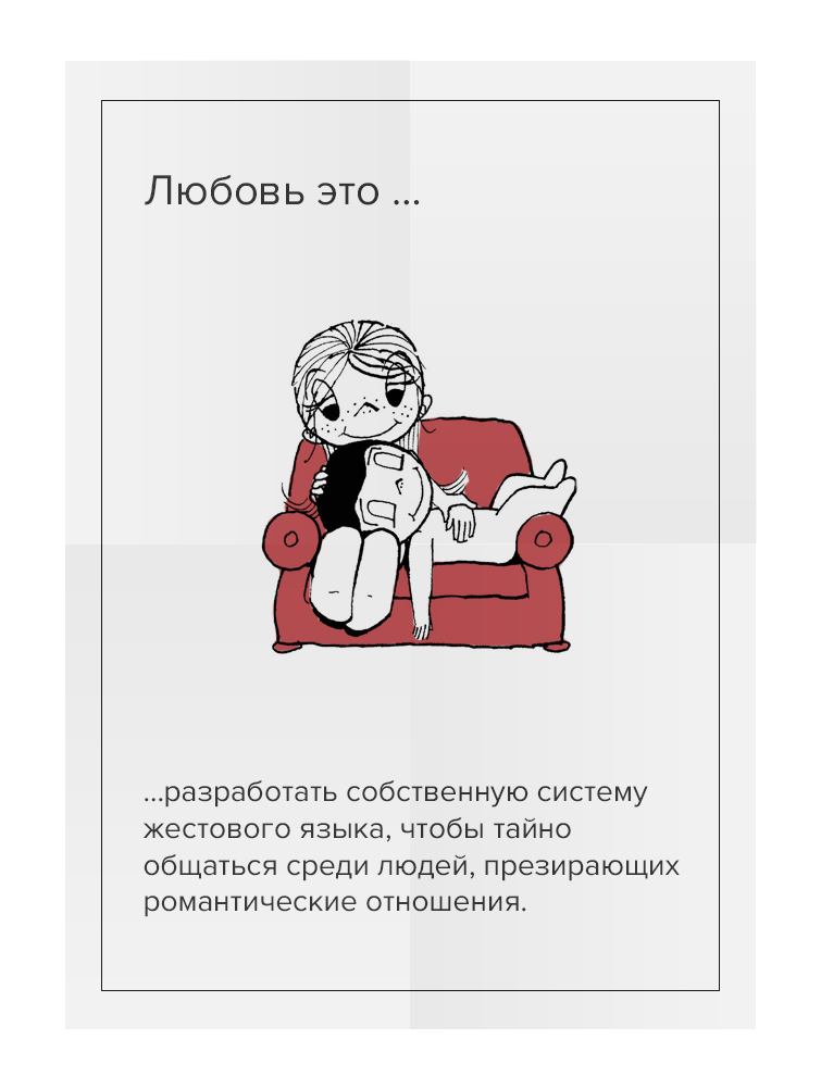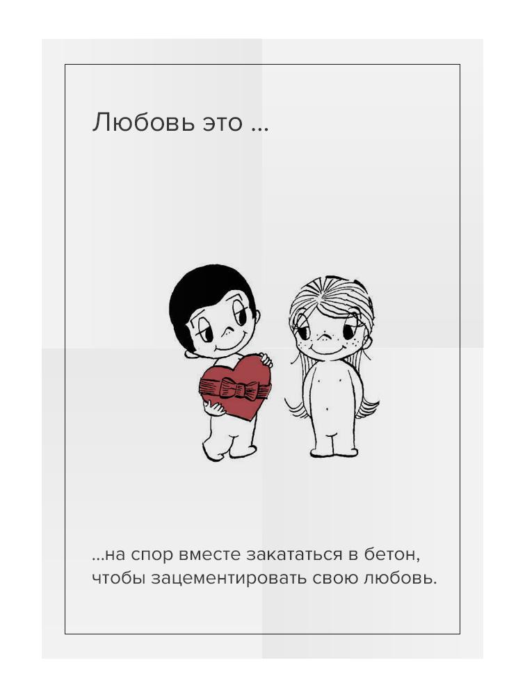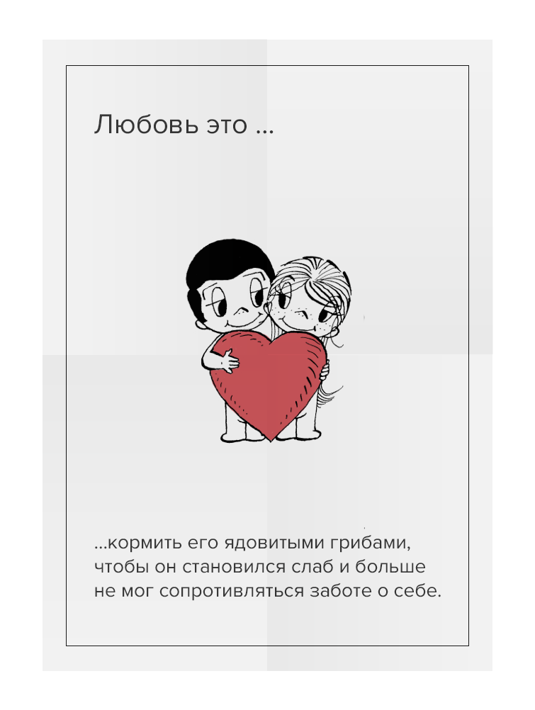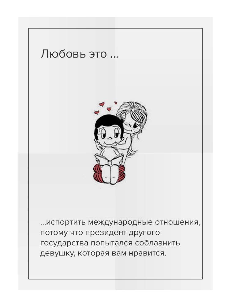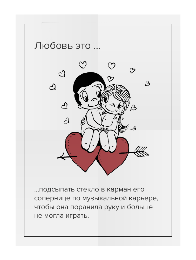 Какой странной, забавной и причудливой видят любовь некоторые кинематографисты! Мы провели исследование и результаты превратили во вкладыши незабвенной жвачки Love is. Наводите курсор на вкладыши, чтобы узнать, что за фильмы скрываются за ними. Только осторожно: не повторяйте эти трюки и не читайте, если боитесь спойлеров.