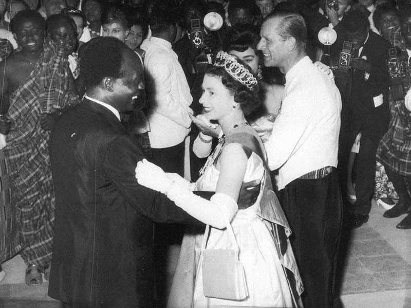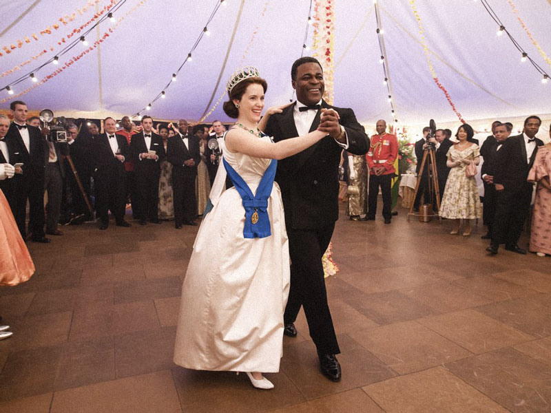 В 1961 году королева действительно танцевала фокстрот с Нкрума Кваме, первым президентом Ганы, — причем, в идентичном белом платье и изумрудной тиаре. Кстати, танцевать фокстрот Нкруму научила жена Луиса Армстронга Люсиль.