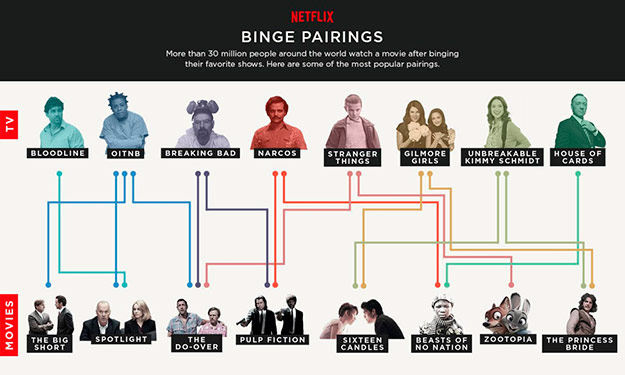 Netflix решил выяснить, что делают люди, после того как досмотрят свой любимый сериал до конца, и проанализировал поведение 86 миллионов пользователей с января по октябрь 2016 года. Как выяснилось, большинство (59%) уже через два с половиной дня принимаются за новый, а в этом «бессериальном» промежутке 61% от предыдущего числа отвлекается на просмотр фильмов. Кино выбирается не просто так по верхам списков «Лучшие из лучших», а с ориентацией на то, чтобы лента была максимально близка по концепции к только что просмотренному сериалу. Например, после «Карточного домика» смотрят «Безродных зверей». Несмотря на то, что политика сменяется войной, главный идейный персонаж обеих работ — бескомпромиссный и жестокий лидер.