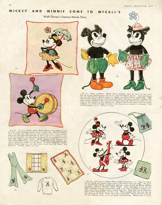 Мягкие игрушки тоже моментально стали крайне востребованными. Первые куклы создала предприимчивая швея Шарлотта Кларк из Лос-Анджелеса вместе со своим 16-летним племянником. Эскизы и финальная работа Шарлотты так понравились Уолту и его брату Рою, что они признали эти куклы «золотым стандартом», на который должны были ориентироваться другие, а в журналах были напечатаны шаблоны, по которым любой желающий мог сшить Микки и Минни Маусов своими руками.
