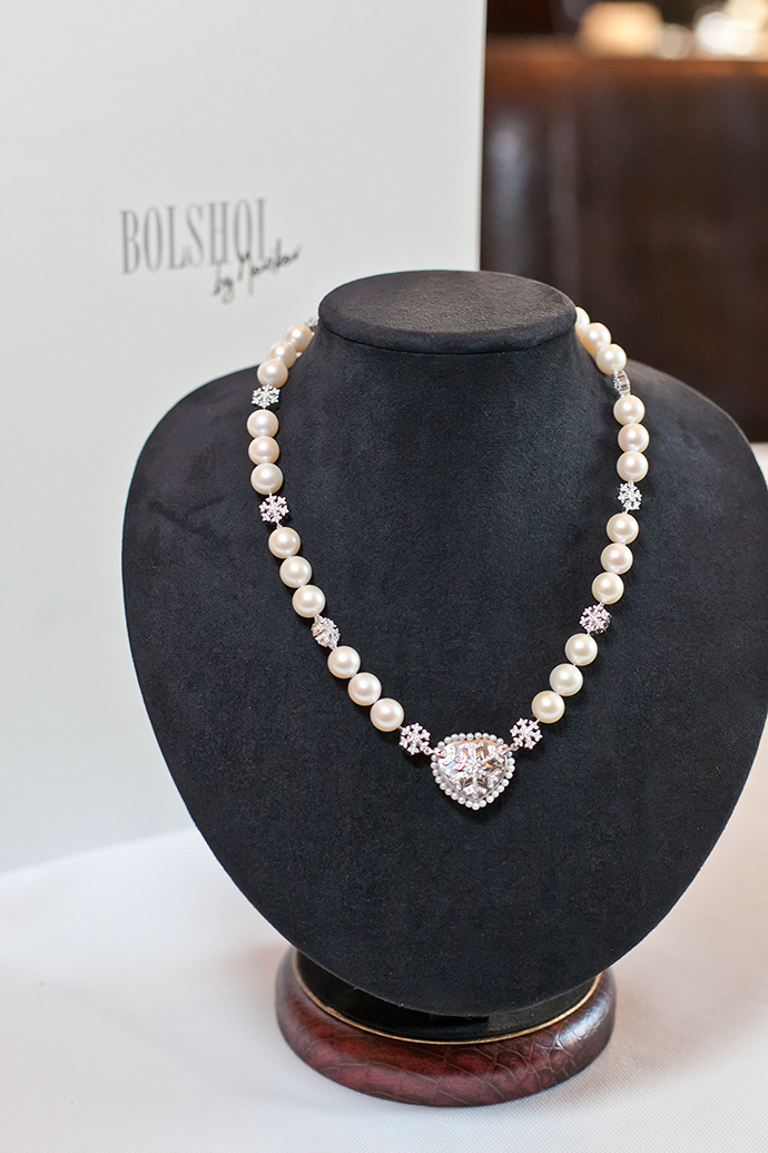 В ресторане "Большой" прошла презентация колье от Натальи Водяновой из коллекции "Русская сказка". Украшение, созданное лучшими мастерами завода "Якутские бриллианты", представляет собой нить из белого жемчуга с драгоценными снежинками из белого золота и бриллиантов. Смысловым центром колье является крупный сапфир в форме сердца, обрамленного маленькими жемчужинками. На поиски подходящего для колье камня ушло немало времени — найти натуральный сапфир столь насыщенного цвета и большого размера очень непросто.