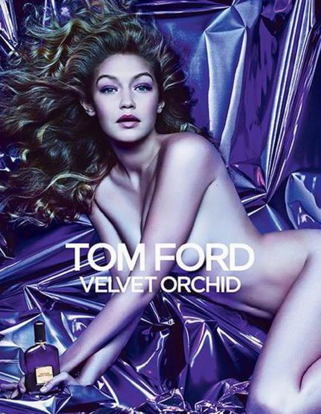 Но самой скандальной была первая рекламная кампания Tom Ford с Хадид. На фотографии для Velvet Orchid она запечатлена обнаженной на фоне блестящей упаковочной бумаги. Многим этот снимок напомнил другой, из рекламной кампании аромата Opium от Yves Saint Laurent, на котором рыжеволосая Софи Даль, тоже полностью обнаженная, возлегала на спине, раскинув ноги. То фото запретили использовать для билбордов из-за многочисленных жалоб на чрезмерную сексуальность изображения — снята рекламная кампания была, разумеется, тоже под руководством Тома Форда, который только-только был назначен креативным директором модного дома.