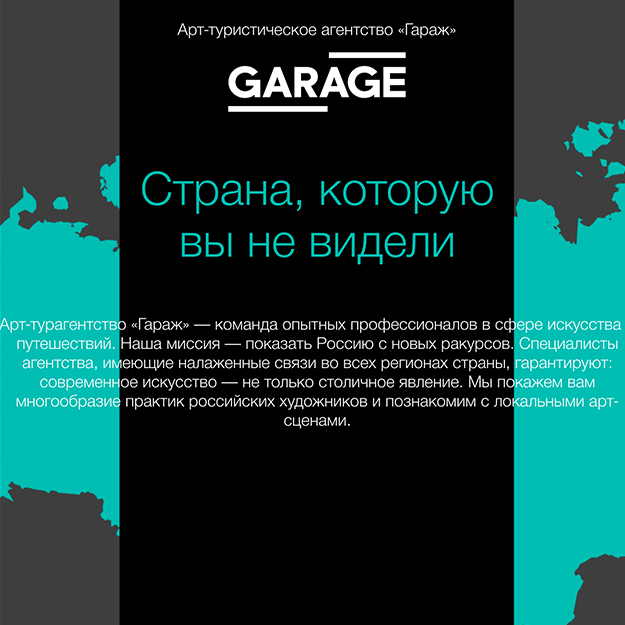 Для работы над проектом art-tour.garagemca.org «Гараж» позвал опытных профессионалов в области путешествий и искусства. Благодаря их связям в разных уголках России клиенты агентства смогут увидеть многообразие художественных направлений и познакомиться с локальными художниками. Первый тур можно будет приобрести с 10 марта 2017 года.