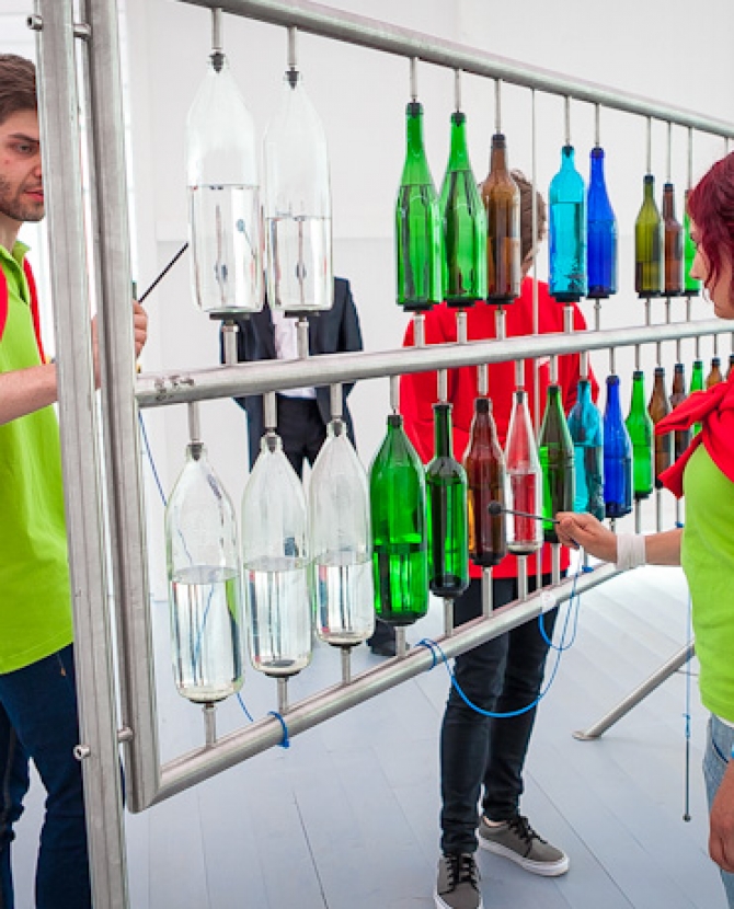 Временное сооружение "Гаража" расположилось около Пионерского пруда в парке Горького, где "потрогать" музыку посетители смогут с 29 июня по 24 июля. Настоящий оркестр под открытым небом, который открылся сегодня в "Гараже", не требует ни глубоких познаний в музыке, ни специальной подготовки. Стать композитором и сыграть свою симфонию на дверных звонках, деталях автомобиля или бутылках с водой сможет любой желающий.