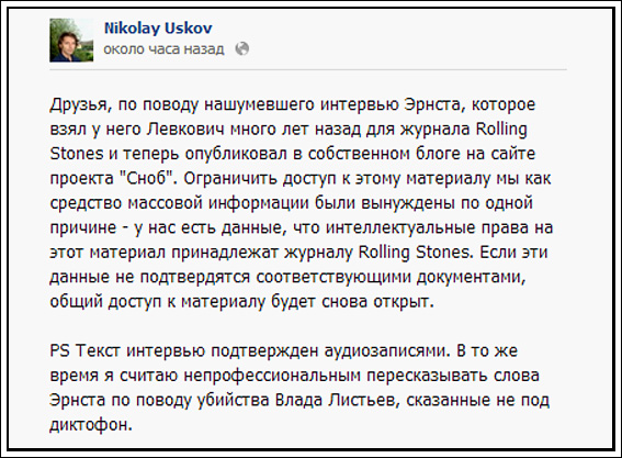 Некоторое время доступ к тексту интервью был ограничен, так как, по словам Николая Ускова, у издания появилась информация, что "интеллектуальные права на этот материал принадлежат журналу Rolling Stones". Позднее текст вернулся на сайт и на момент написания данного материала доступен участникам проекта "Сноб", но уже без слов Эрнста, сказанных не под запись: "Фрагмент про Листьева мы Евгения попросили удалить. Это неэтично — писать фразы, взятые не под запись, тот же Первый канал может предъявить нам иск. Все остальное интервью сделано под запись, там все в порядке, претензий нет," — заявил Усков изданию "Коммерсантъ". Отметим, что ранее ссылку на полный текст интервью в кэше Google опубликовал у себя портал Lenta.ru.