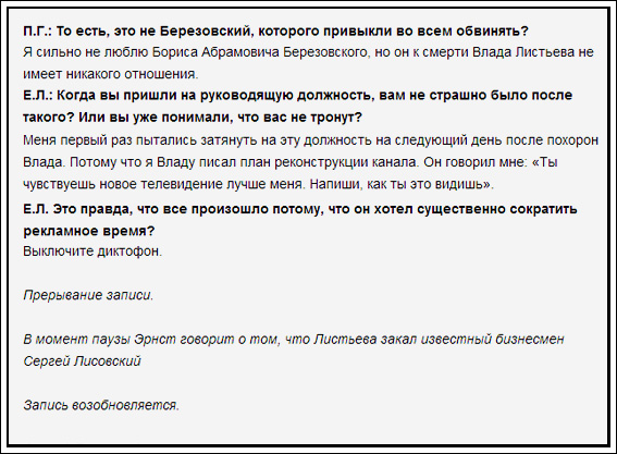 В тексте материала Левкович сохранил слова Эрнста, который время от времени просил "выключить диктофон". Журналист просьбы уважал, тем не менее информацию, озвученную не под запись, передал: "В момент паузы Эрнст говорит о том, что Листьева заказал известный бизнесмен Сергей Лисовский," — написал Левкович.