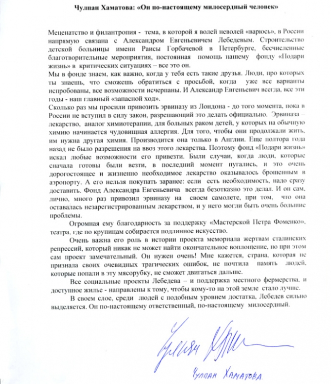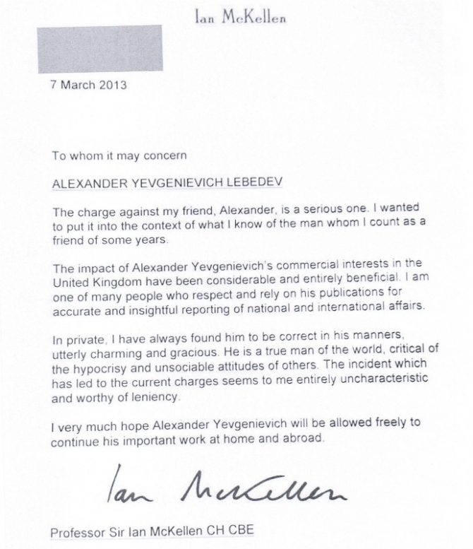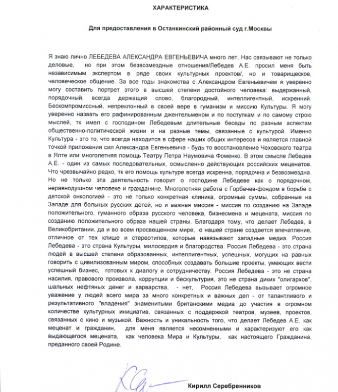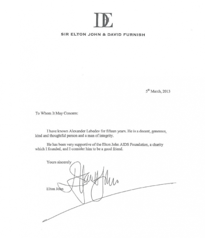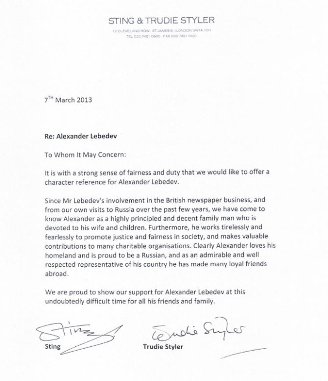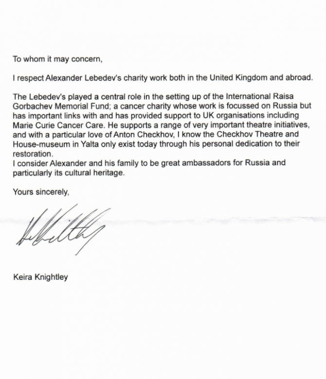 "Я уважаю Александра Лебедева за его благотворительную работу и в Великобритании, и за рубежом," — написала Кира Найтли. "Александр, несомненно, любит свою родину и гордится тем, что он русский," — написал в своем послании суду Стинг.