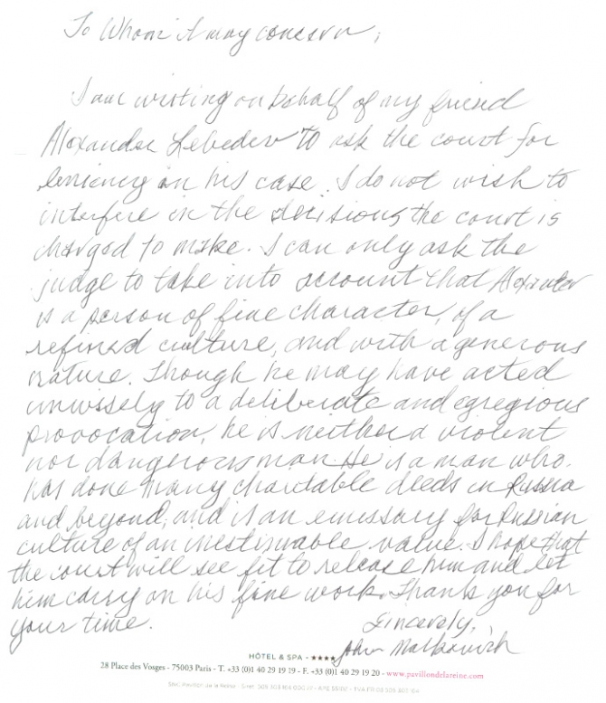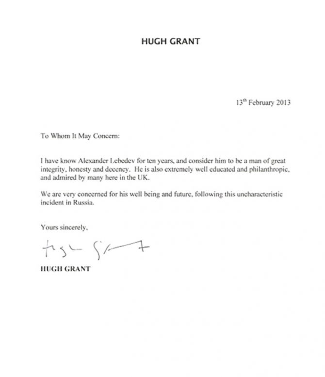 И пока Сергей Полонский готовился к слушаниям в камбоджийской тюрьме, Алекандр Лебедев решил заручиться поддержкой своих старых знакомых. Благо, в их числе оказались люди, фамилии которых наверняка знают даже в Останкинском суде. Характеристики Лебедеву написали Хью Грант, Джон Малкович, Наталья Водянова, Элтон Джон, Стинг с супругой, Кира Найтли и многие другие деятели искусства.
