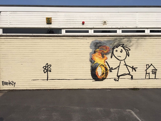 Бэнкси подарил начальной школе свои граффити в благодарность за то, что та, в свою очередь, носит его гордое художественное имя. Школе достался незамысловатый сюжет, в центре которого девочка и подожженная ею автомобильная шина, за ней остается отчий дом, а может, и alma mater начальных классов, а вдали виднеется цветок. В общем, никаких объяснений Бэнкси не оставил, зато не забыл отправить школе письмо: «Дорогая школа Bridge Farm, хочу поблагодарить вас за письмо и за то, что назвали вашу школу моим именем. Пожалуйста, примите и мою картину. Если же она вам не понравится, не премините что-то добавить — я уверен, учителя возражать не будут. И запомните: всегда проще заслужить прощение, чем получить разрешение».
