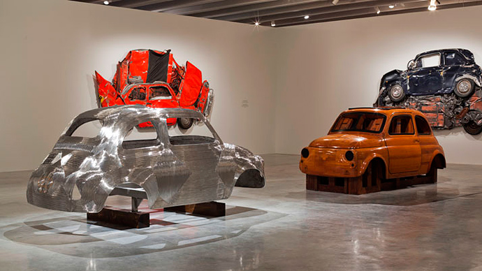 Арад то разрушает его, то кропотливо собирает вновь: в скульптурах серии Pressed Flower автомобиль сжат, буквально изжеван и придавлен к стене, а в работе Roddy Giacosa его корпус шаг за шагом составлен из сотни стальных стержней. В центре зала находится и другая искусственно созданная, деревянная версия машины — скульптура Centro Stile Fiat Wood mould for Fiat 500.