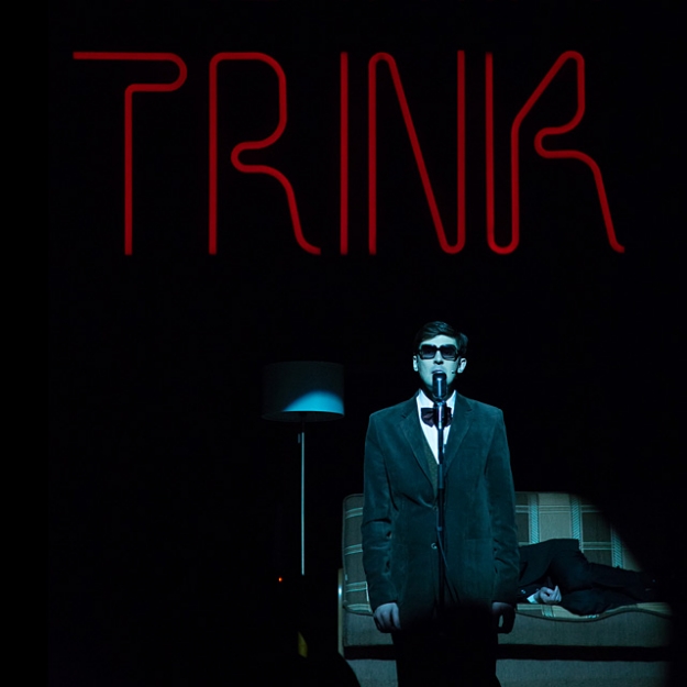 В декорациях к спектаклю вполне мог бы снять свой фильм Уэс Андерсон: письменный стол и сидящего за ним забавно-серьезного рассказчика в солнечных очках нетрудно представить в "Поезде на Дарджилинг" или "Отеле "Гранд Будапешт". Стены комнаты, где обитает Пантагрюэль и еще десяток персонажей спектакля, неравномерно окрашены в кроваво-красный и увенчаны огромной неоновой надписью Trink в лучших традициях художников Трейси Эмин и Брюса Наумана.